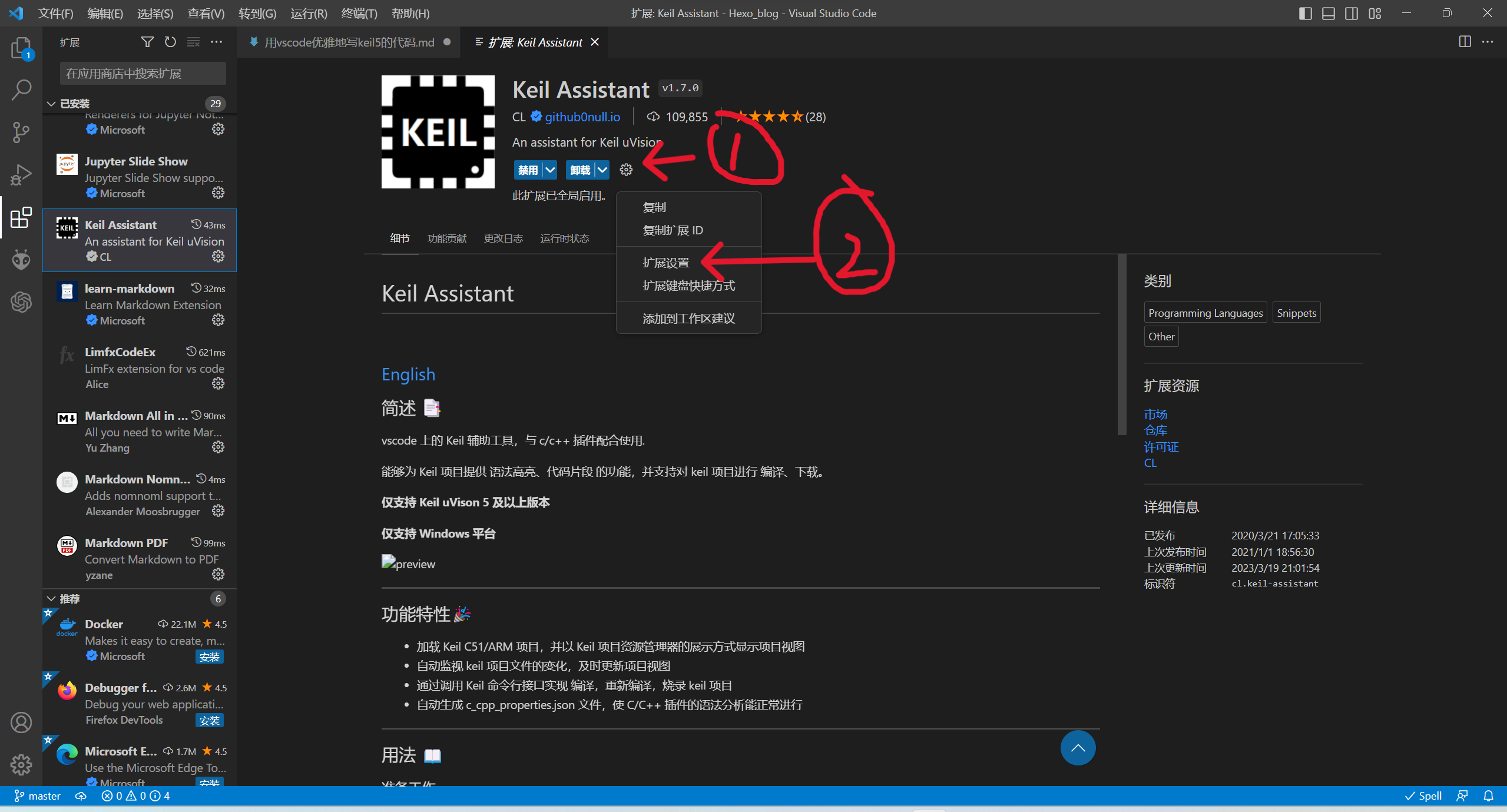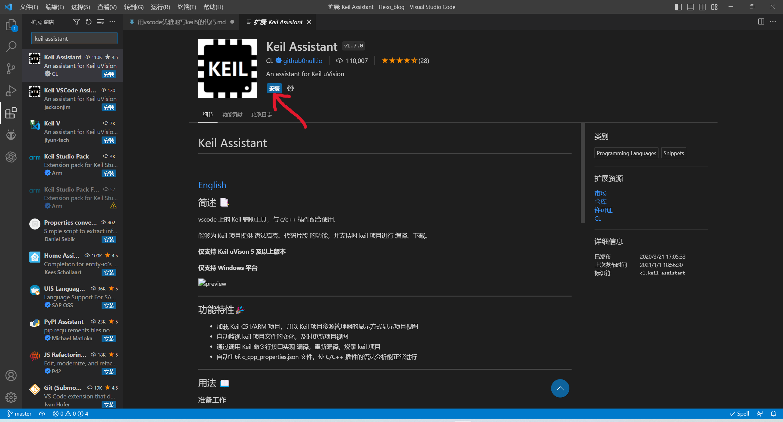 在vscode的扩展商店搜索Keil Assistant,点击“安装”。